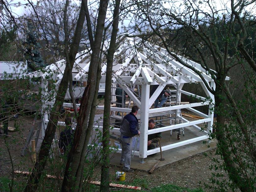 Nachdem die Mitglieder des Schulelternbeirats, des Fördervereins und des Kollegiums der Grundschule Idarwald vor den Osterferien die vielen Balken der Schutzhütte gestrichen hatten, konnte schon am Freitag, dem 20. April, mit dem Aufbau des Pavillions begonnen werden.